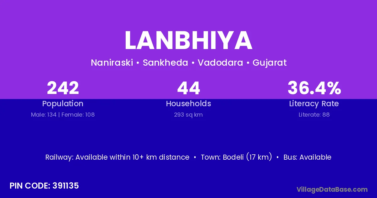 Bodeli (17 km) is the nearest town to Lanbhiya village for major economic activities and is located approximately 17 km away.