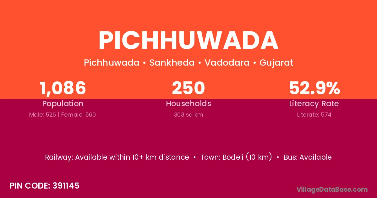 Pichhuwada village has a total population of 1,086 people, of which 526 are males and 560 are females.