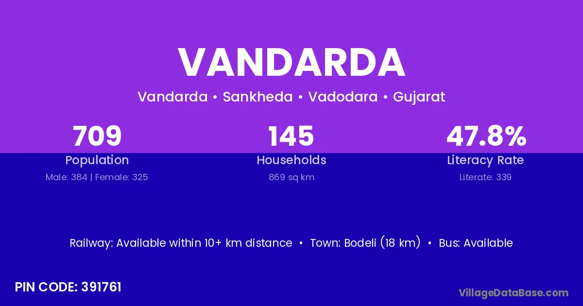 Bodeli (18 km) is the nearest town to Vandarda village for major economic activities and is located approximately 18 km away.