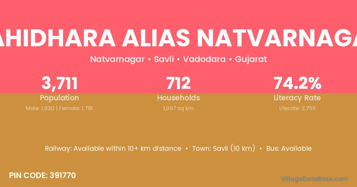 Bahidhara Alias Natvarnagar village has a total population of 3,711 people, of which 1,930 are males and 1,781 are females.