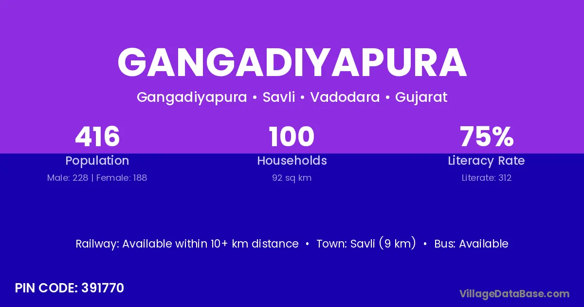 Savli (9 km) is the nearest town to Gangadiyapura village for major economic activities and is located approximately 9 km away.