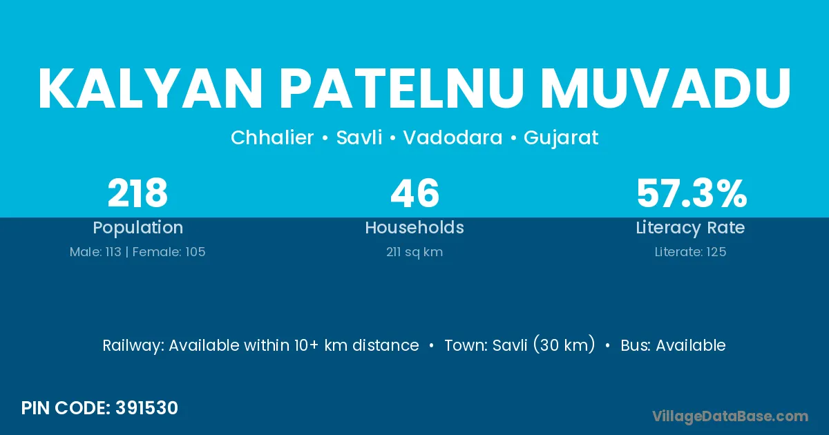 Savli (30 km) is the nearest town to Kalyan Patelnu Muvadu village for major economic activities and is located approximately 30 km away.