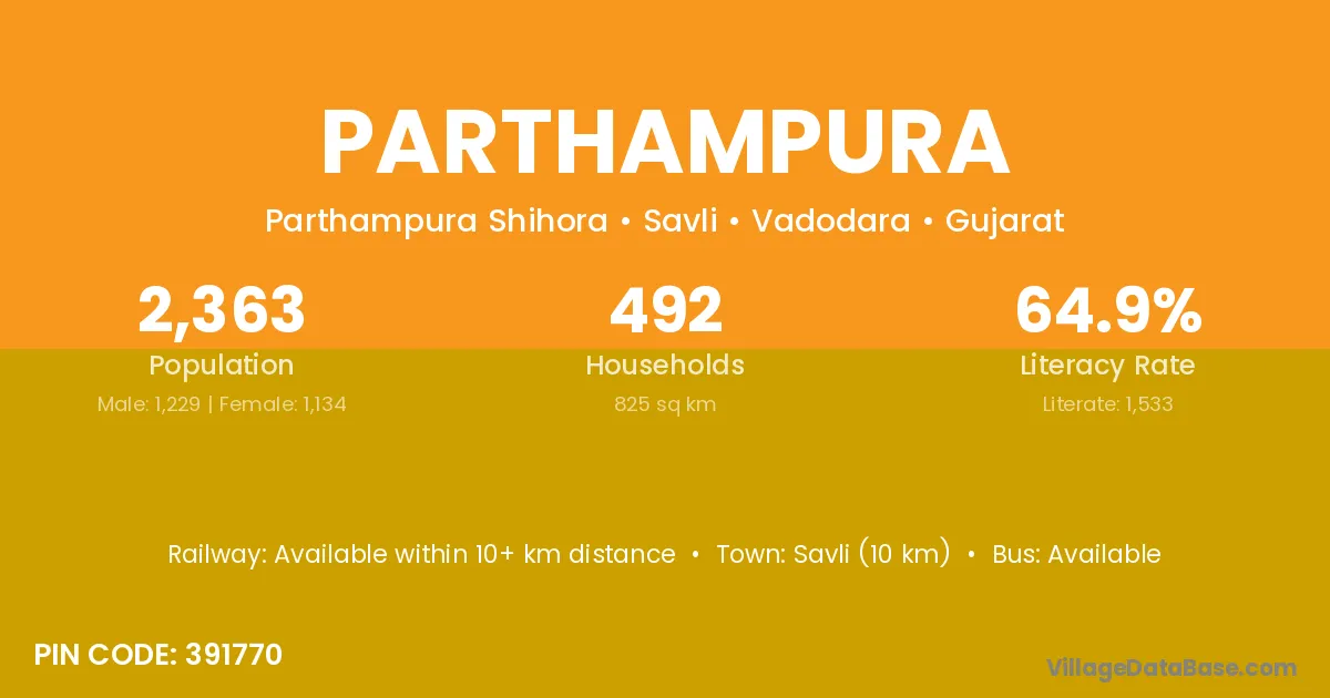 Savli (10 km) is the nearest town to Parthampura village for major economic activities and is located approximately 10 km away.
