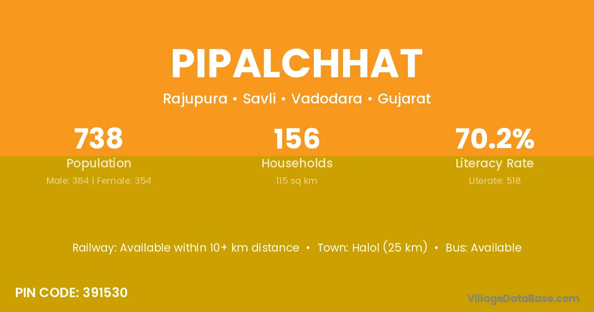 Halol (25 km) is the nearest town to Pipalchhat village for major economic activities and is located approximately 25 km away.