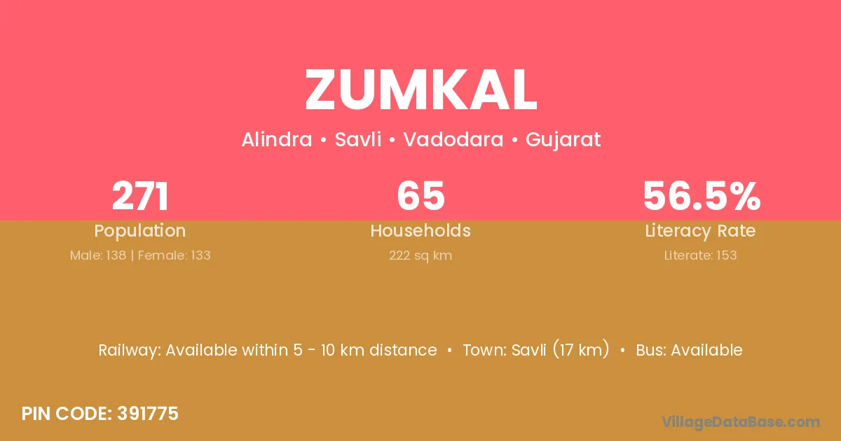 Savli (17 km) is the nearest town to Zumkal village for major economic activities and is located approximately 17 km away.