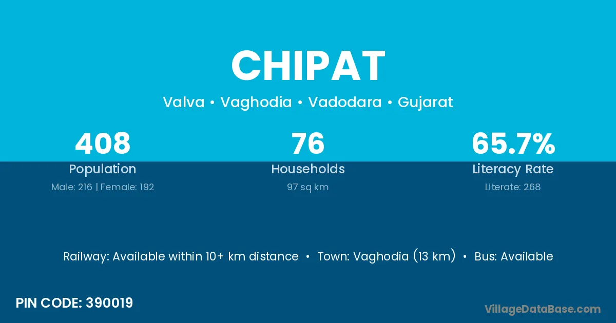 Vaghodia (13 km) is the nearest town to Chipat village for major economic activities and is located approximately 13 km away.