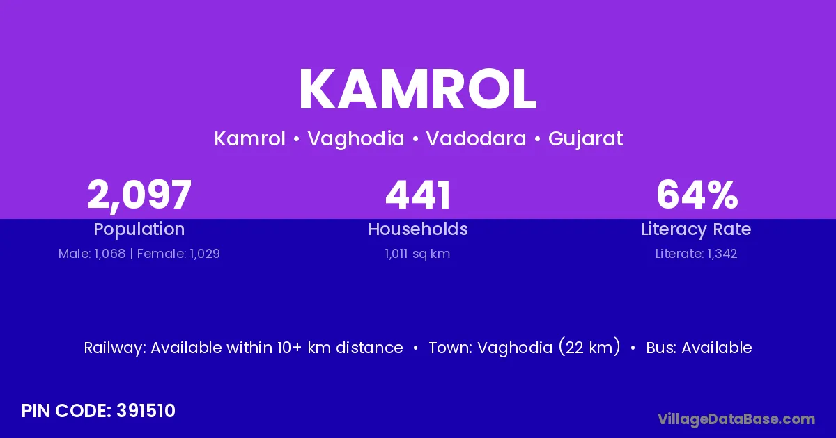 Vaghodia (22 km) is the nearest town to Kamrol village for major economic activities and is located approximately 22 km away.