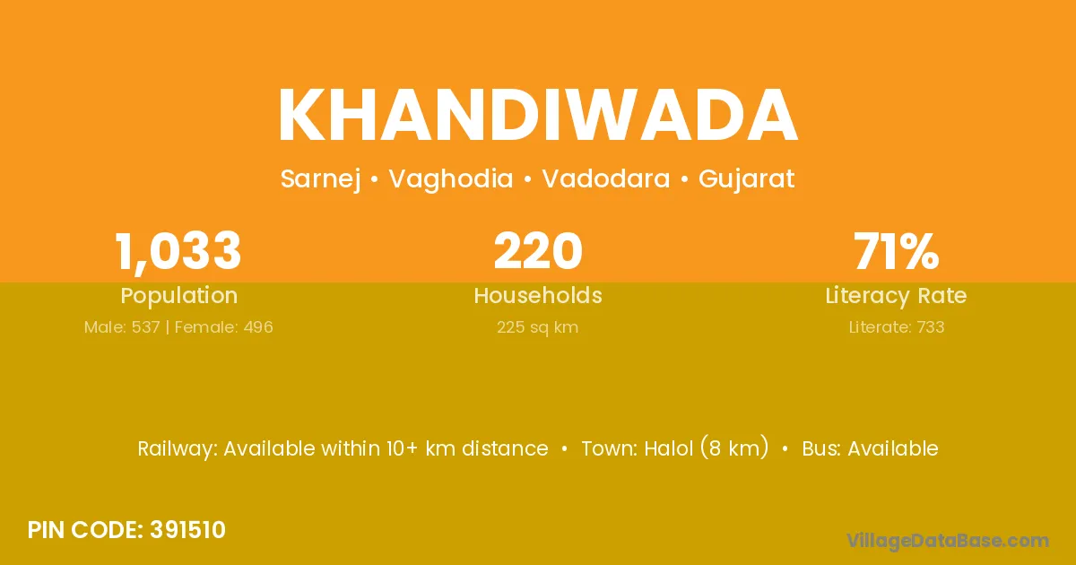 Halol (8 km) is the nearest town to Khandiwada village for major economic activities and is located approximately 8 km away.