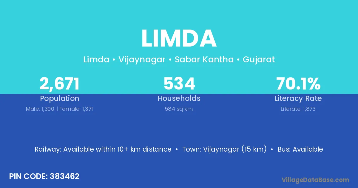 Vaghodia (5 km) is the nearest town to Limda village for major economic activities and is located approximately 5 km away.