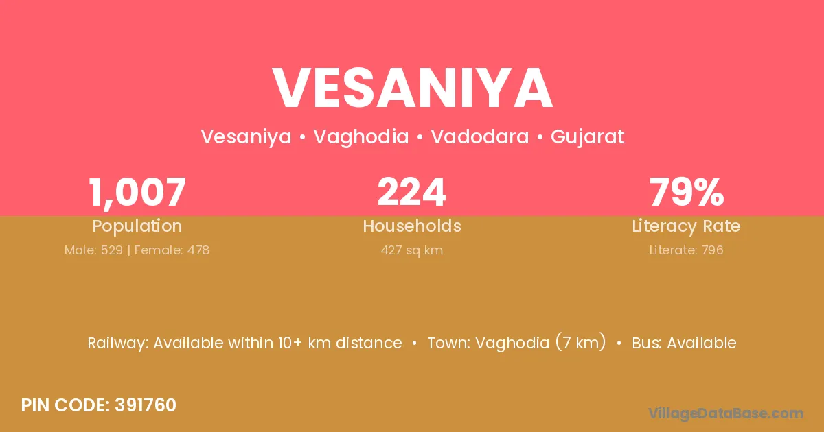 Vaghodia (7 km) is the nearest town to Vesaniya village for major economic activities and is located approximately 7 km away.