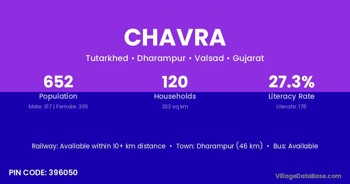According to Census 2011 information, the village code of Chavra village is 396050.