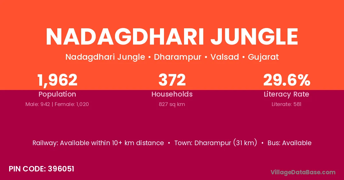 Dharampur (31 km) is the nearest town to Nadagdhari Jungle village for major economic activities and is located approximately 31 km away.