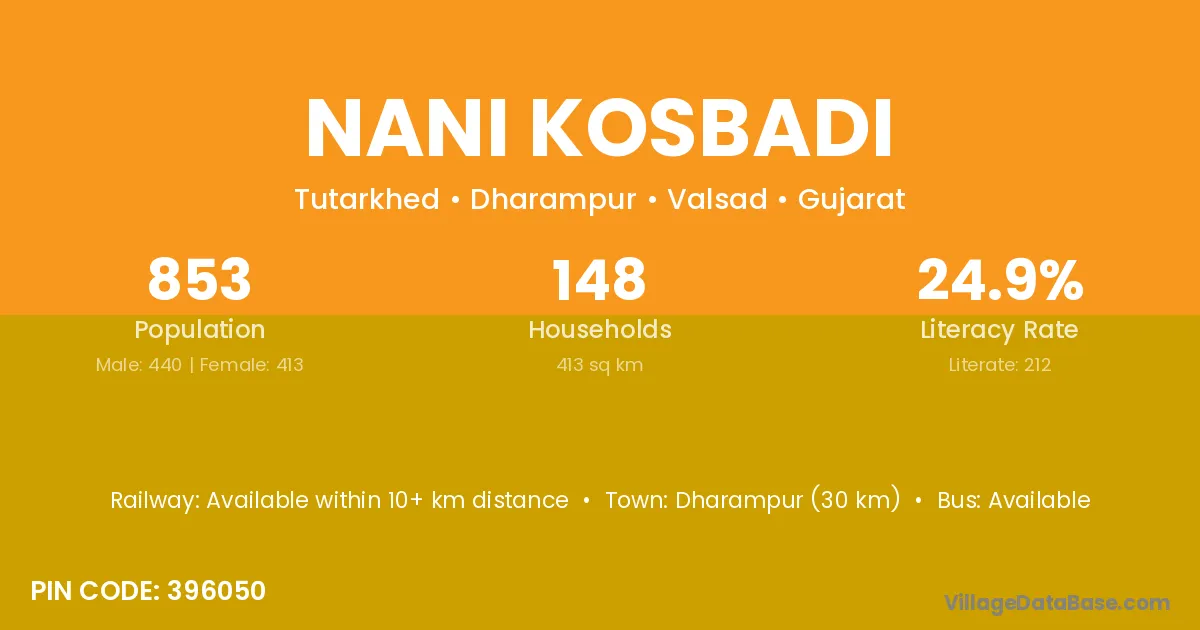 Nani Kosbadi village has a total population of 853 people, of which 440 are males and 413 are females.