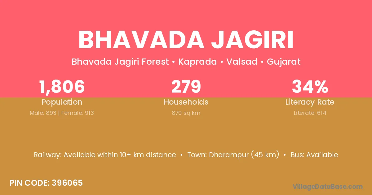 Dharampur (45 km) is the nearest town to Bhavada Jagiri village for major economic activities and is located approximately 45 km away.