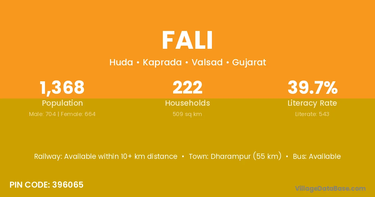 Dharampur (55 km) is the nearest town to Fali village for major economic activities and is located approximately 55 km away.