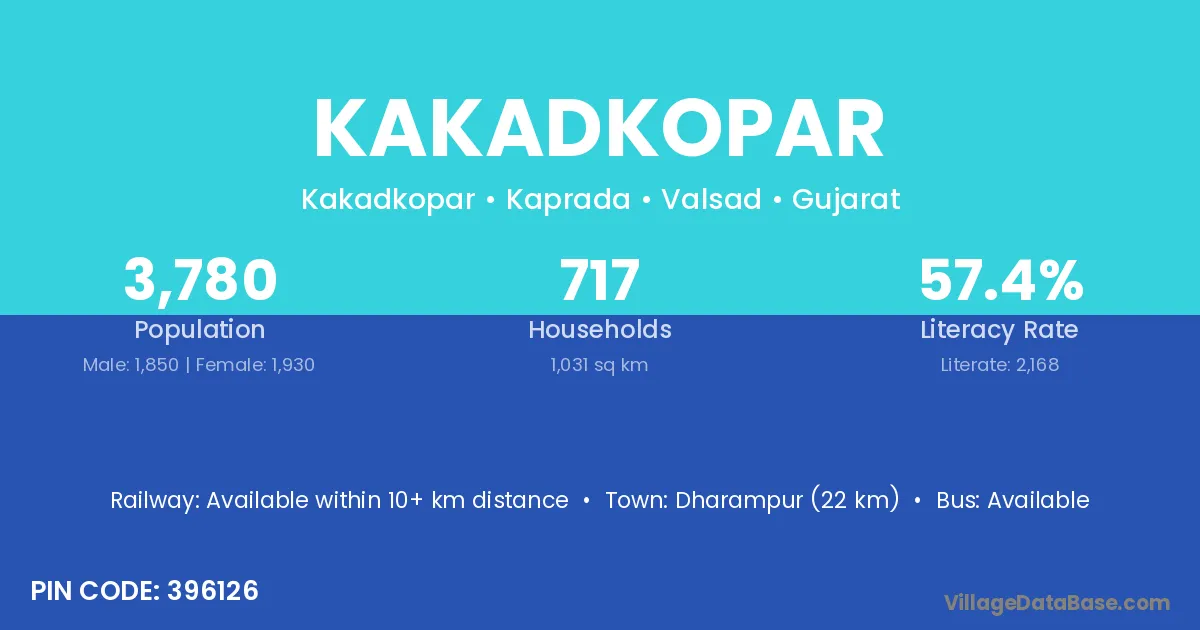 Dharampur (22 km) is the nearest town to Kakadkopar village for major economic activities and is located approximately 22 km away.