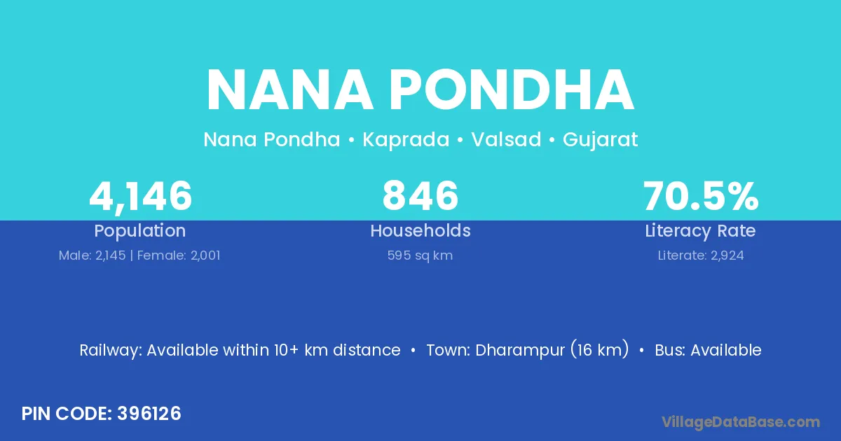 Dharampur (16 km) is the nearest town to Nana Pondha village for major economic activities and is located approximately 16 km away.