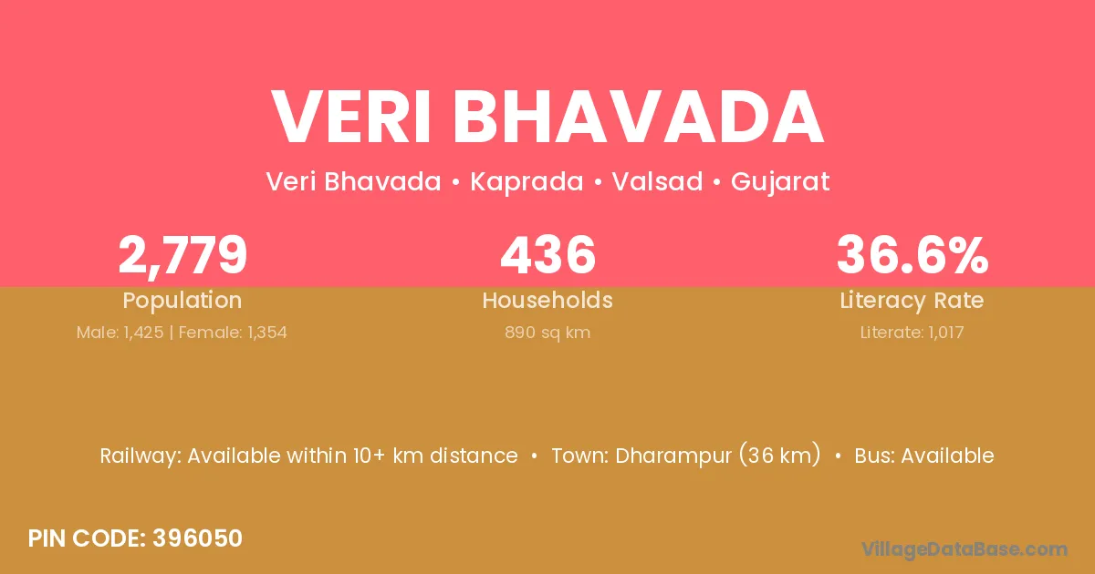 Dharampur (36 km) is the nearest town to Veri Bhavada village for major economic activities and is located approximately 36 km away.