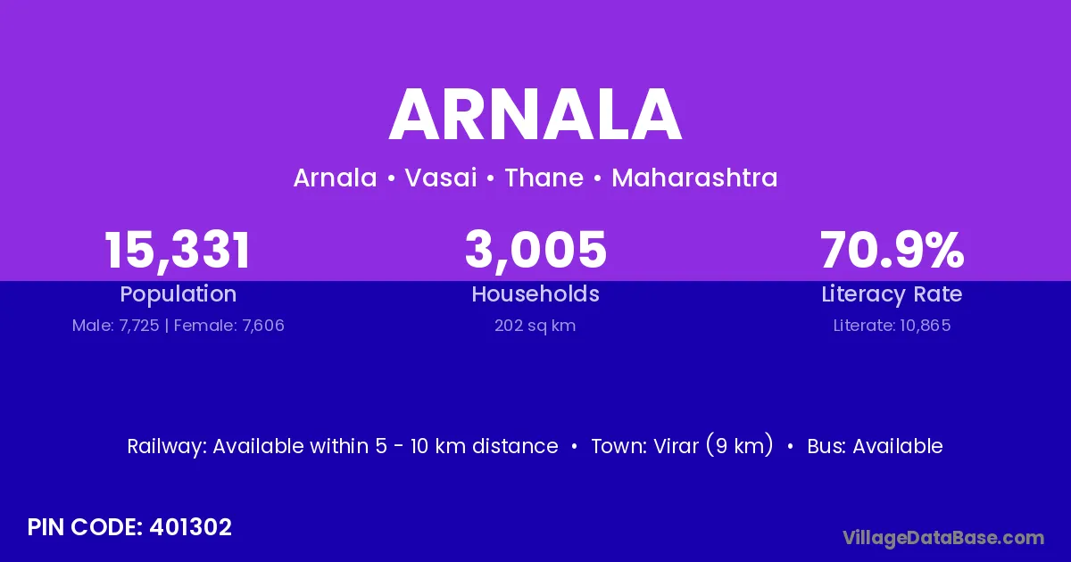 Pardi (10 km) is the nearest town to Arnala village for major economic activities and is located approximately 10 km away.