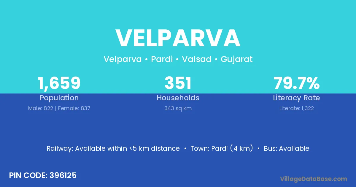 Pardi (4 km) is the nearest town to Velparva village for major economic activities and is located approximately 4 km away.