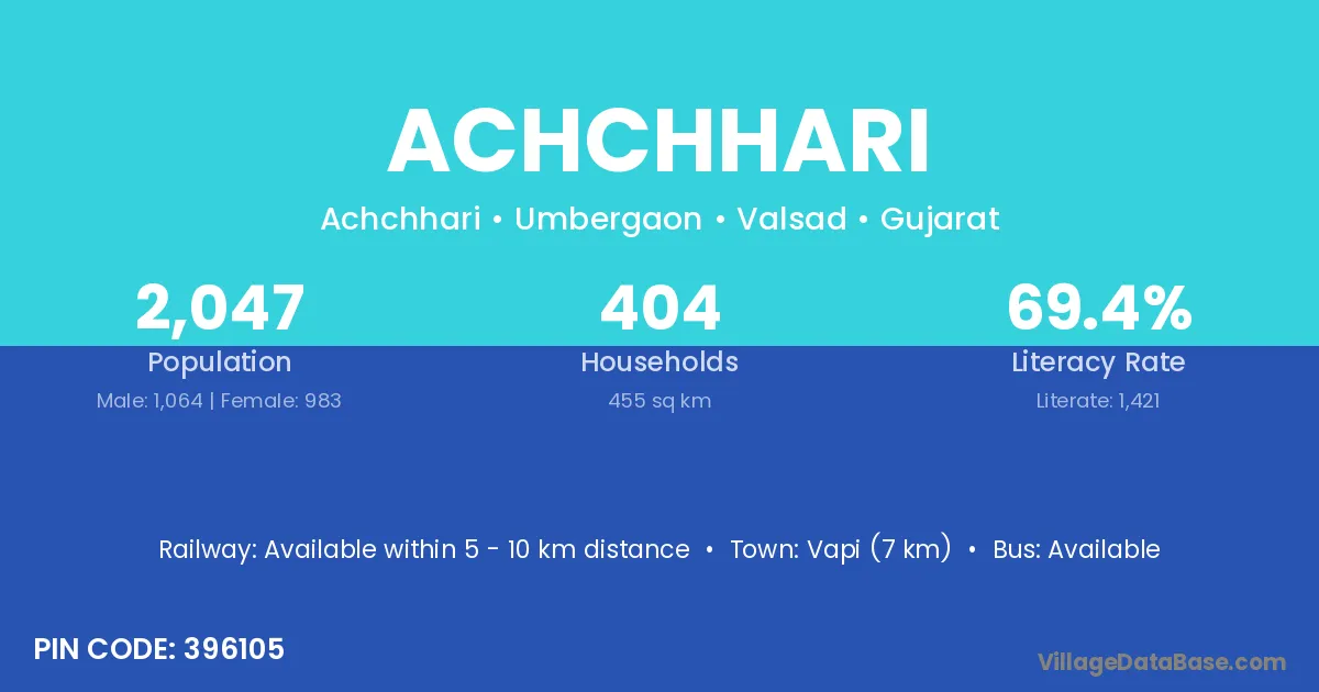 Vapi (7 km) is the nearest town to Achchhari village for major economic activities and is located approximately 7 km away.