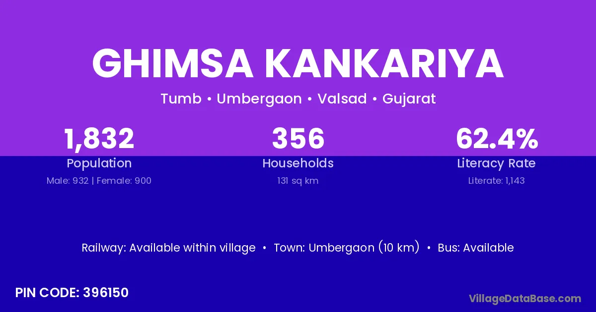 Umbergaon (10 km) is the nearest town to Ghimsa Kankariya village for major economic activities and is located approximately 10 km away.