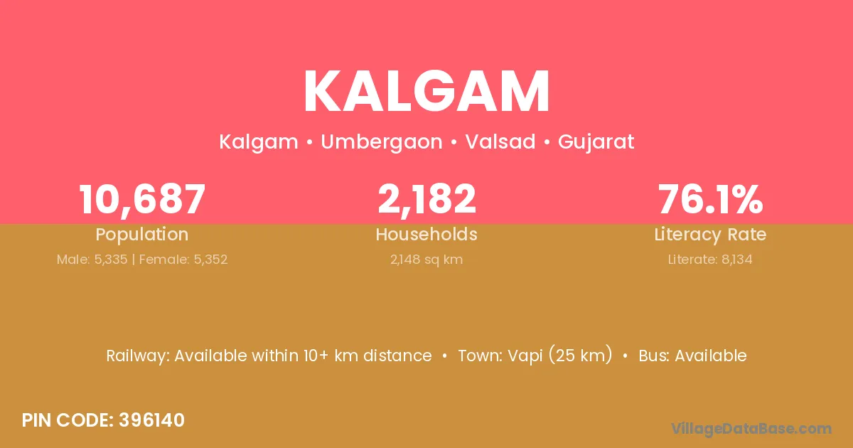 Vapi (25 km) is the nearest town to Kalgam village for major economic activities and is located approximately 25 km away.