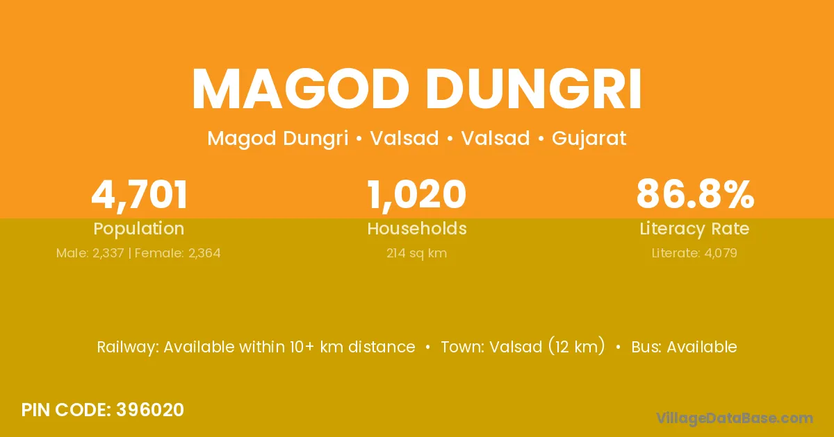 Valsad (12 km) is the nearest town to Magod Dungri village for major economic activities and is located approximately 12 km away.