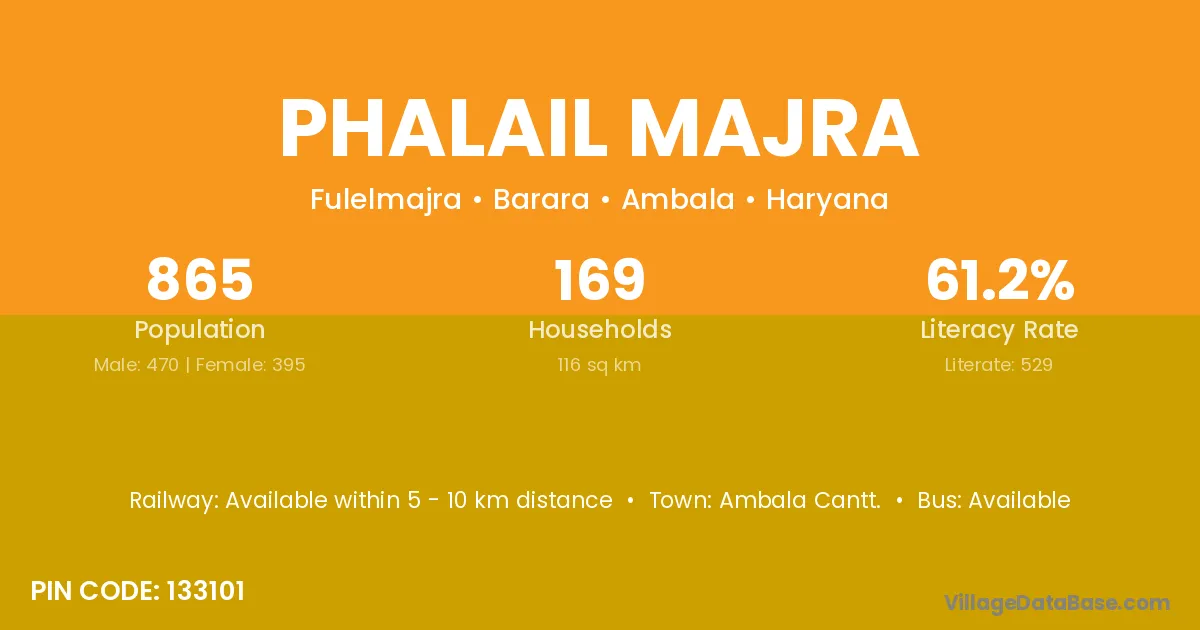 Phalail Majra village has a total population of 865 people, of which 470 are males and 395 are females.