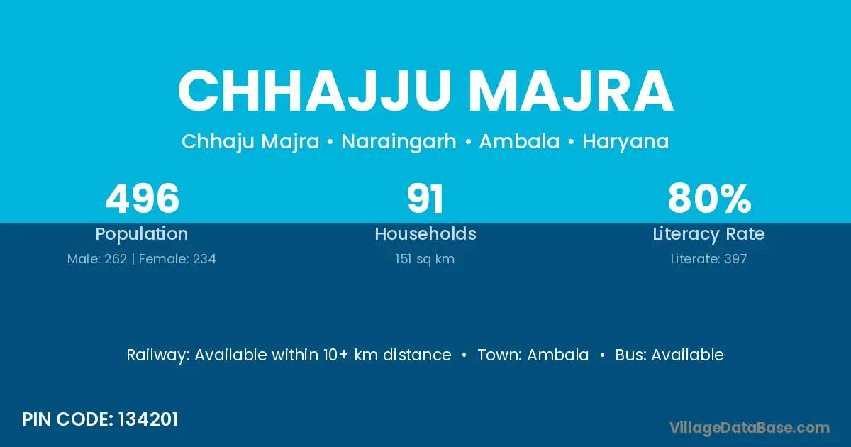 Chhajju Majra village has a total population of 496 people, of which 262 are males and 234 are females.