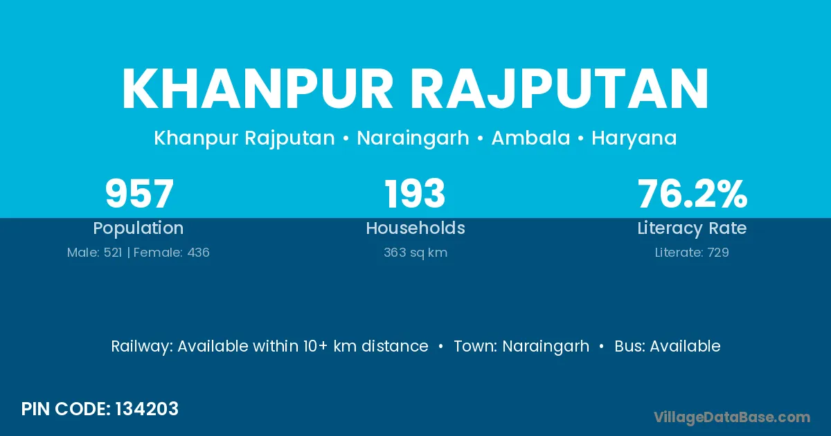Khanpur Rajputan village has a total population of 957 people, of which 521 are males and 436 are females.