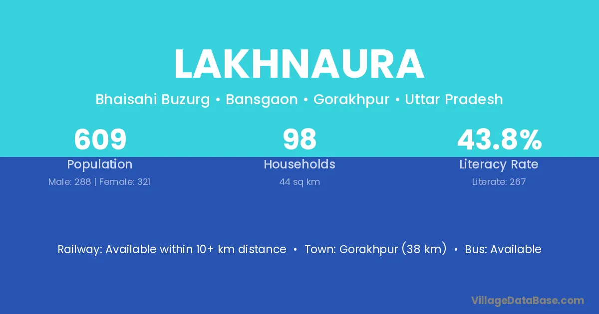 The literacy rate of Lakhnaura village is 68.51%. Male literacy stands at 74.09% and female literacy at 61.97%.