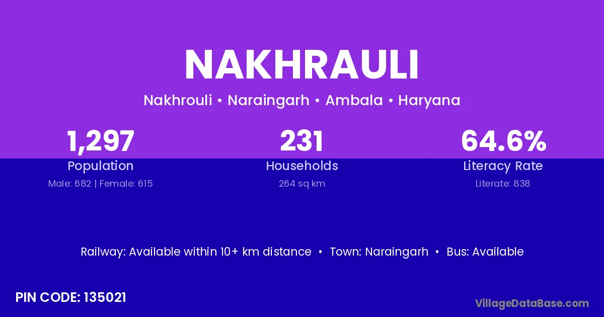 Nakhrauli village has a total population of 1,297 people, of which 682 are males and 615 are females.