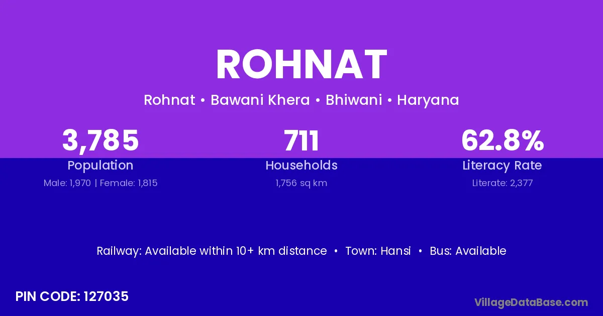 Rohnat village has a total population of 3,785 people, of which 1,970 are males and 1,815 are females.