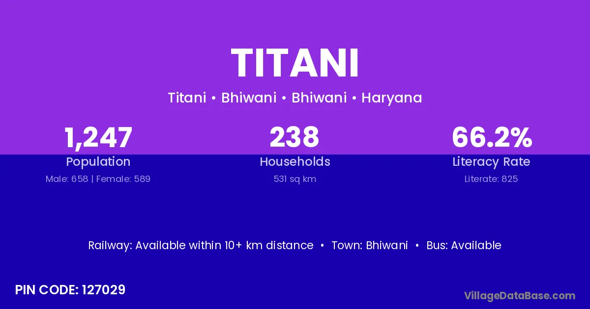 Titani village has a total population of 1,247 people, of which 658 are males and 589 are females.