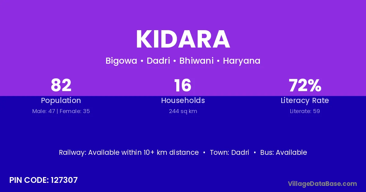 Kidara village has a total population of 82 people, of which 47 are males and 35 are females.