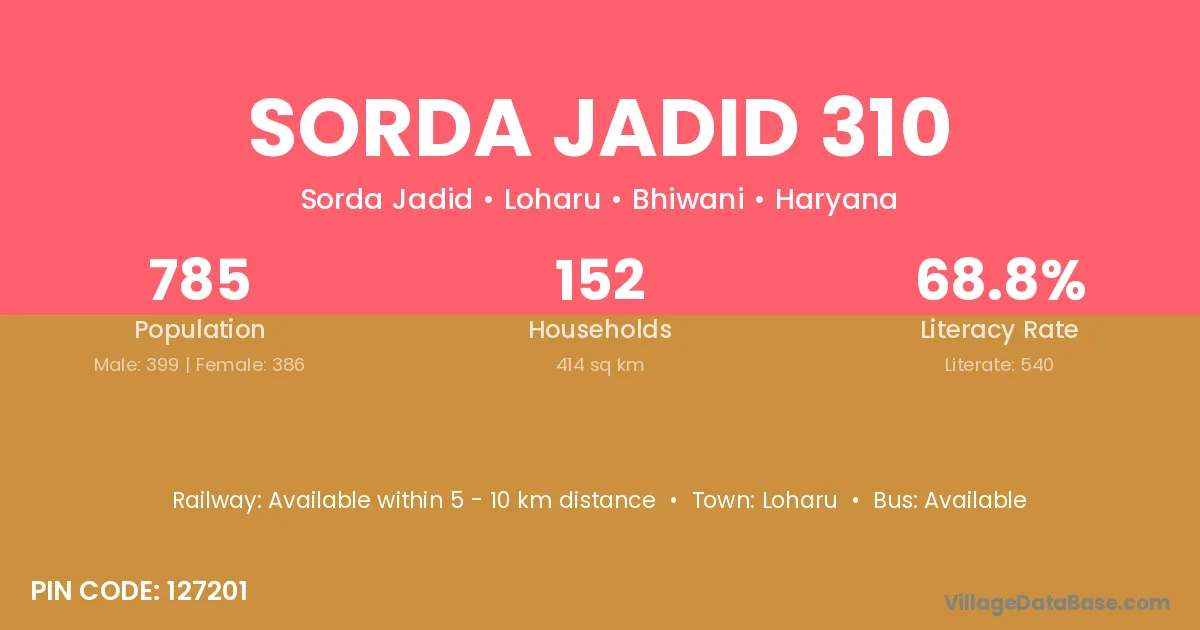 Sorda Jadid 310 village has a total population of 785 people, of which 399 are males and 386 are females.