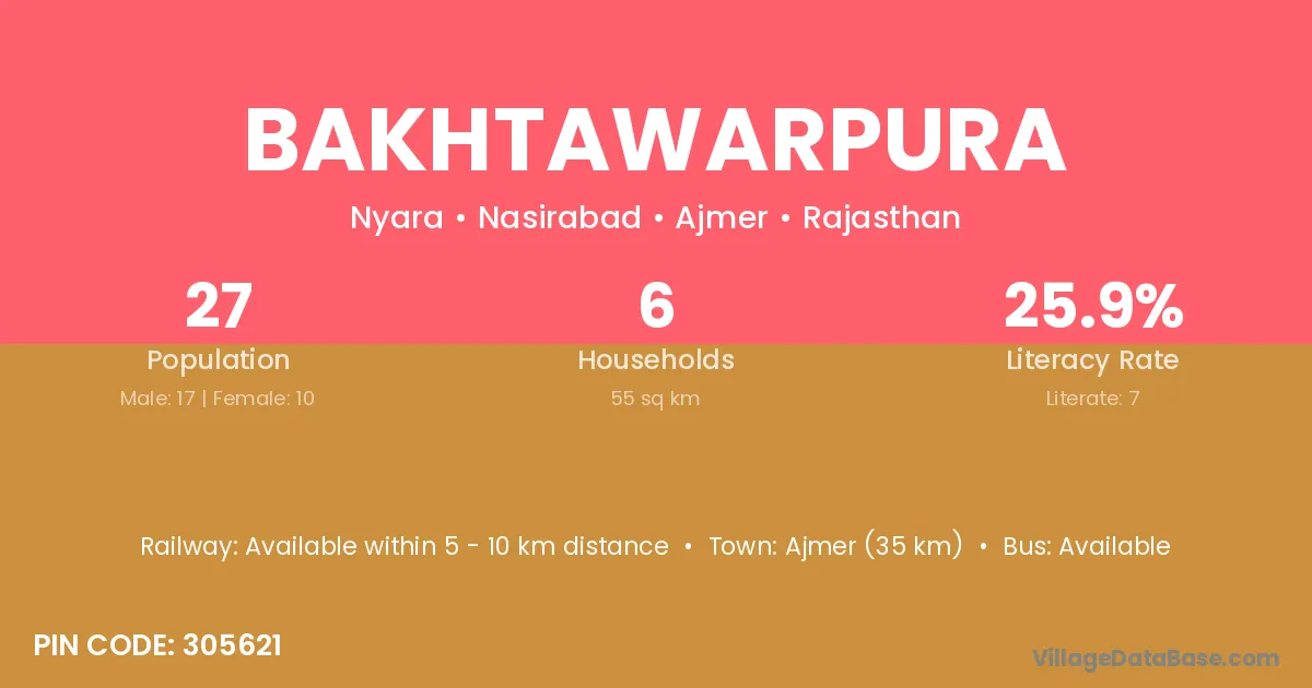 Bakhtawarpura village has a total population of 1,229 people, of which 655 are males and 574 are females.