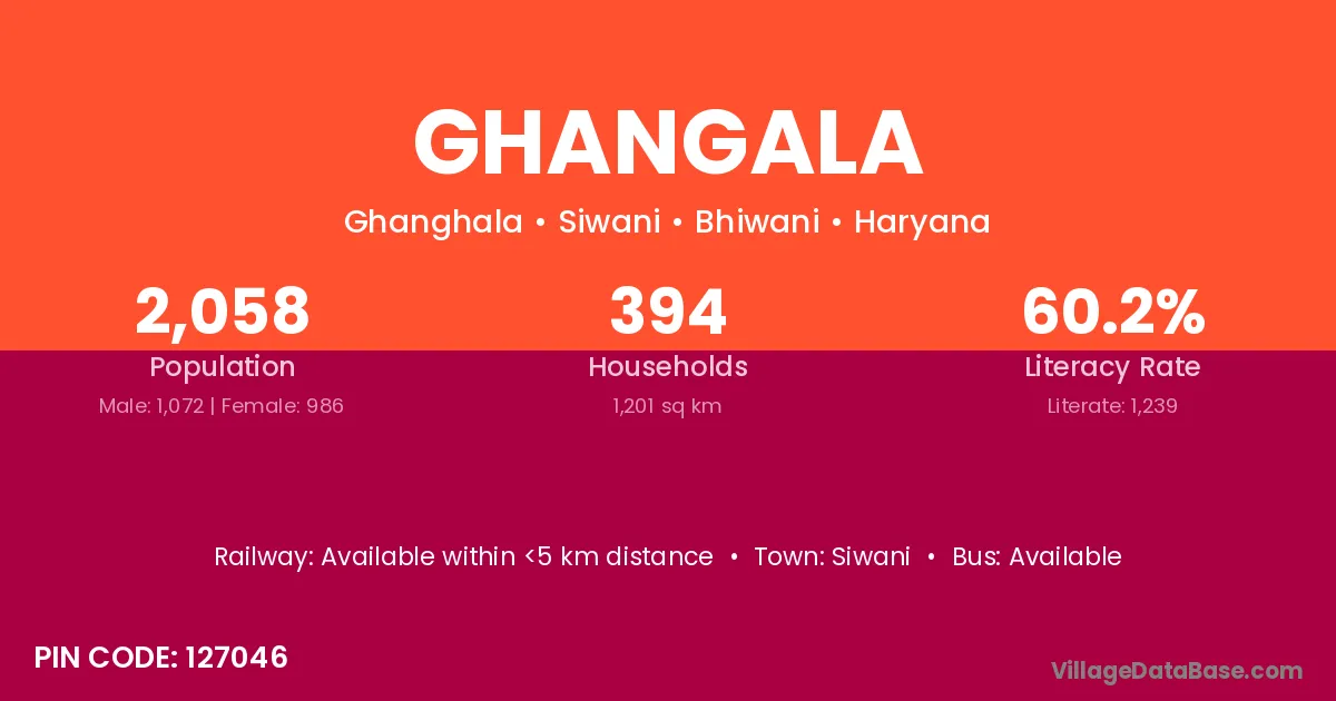 Ghangala village has a total population of 2,058 people, of which 1,072 are males and 986 are females.