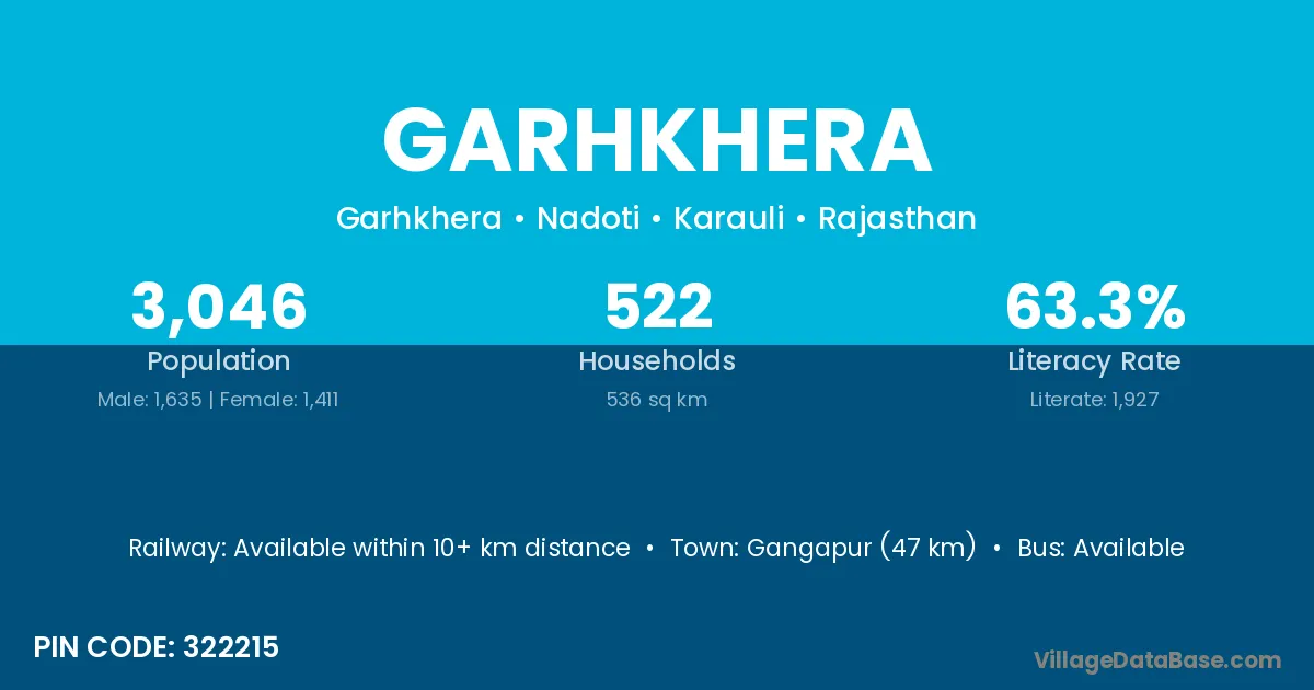 The literacy rate of Garhkhera village is 63.36%. Male literacy stands at 73.21% and female literacy at 51.56%.