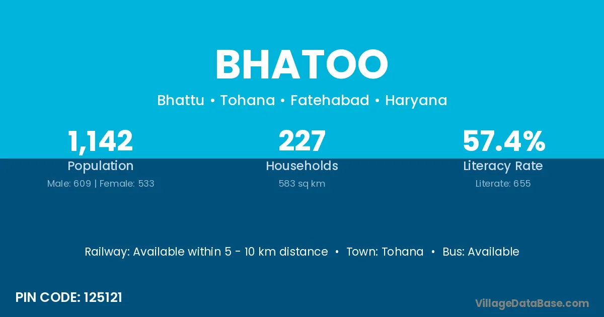 Bhatoo village has a total population of 1,142 people, of which 609 are males and 533 are females.