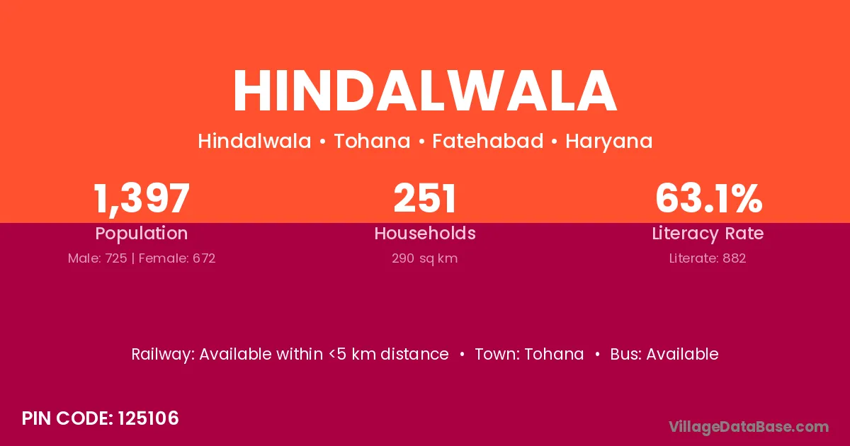 Hindalwala village has a total population of 1,397 people, of which 725 are males and 672 are females.
