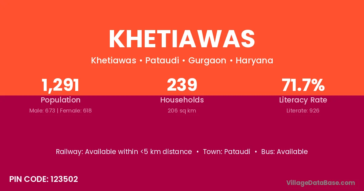 Khetiawas village has a total population of 1,291 people, of which 673 are males and 618 are females.