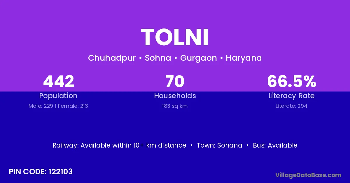According to Census 2011 information, the village code of Tolni village is 122103.