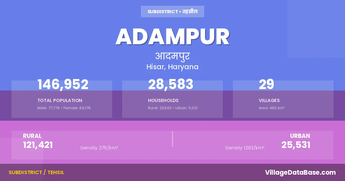According to the 2011 census The total area of Adampur Tehsil is 460 km², with a population of 146952 people. The population density is 319 inhabitants per square kilometre, and there are approximately 28583 houses in the sub district.