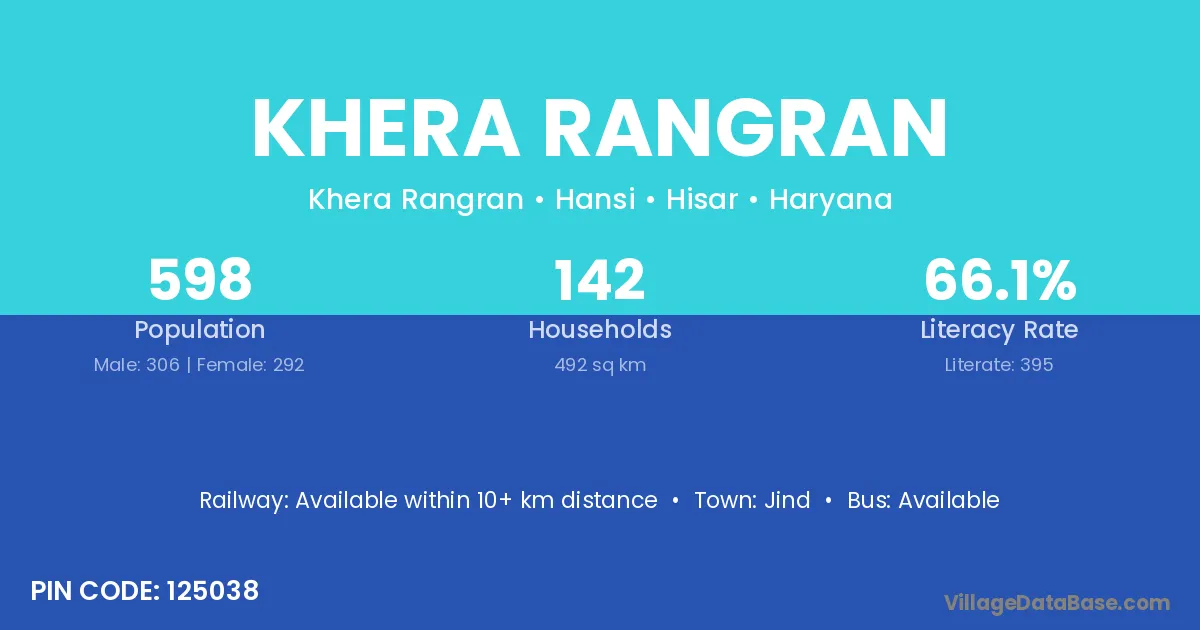 Khera Rangran village has a total population of 598 people, of which 306 are males and 292 are females.