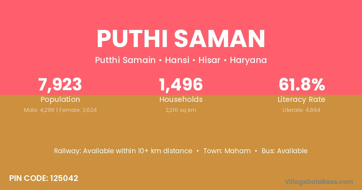 Puthi Saman village has a total population of 7,923 people, of which 4,299 are males and 3,624 are females.