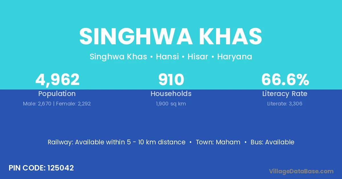 Singhwa Khas village has a total population of 4,962 people, of which 2,670 are males and 2,292 are females.
