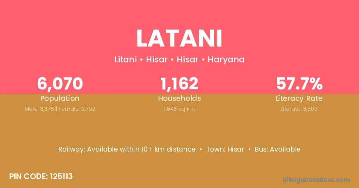 Latani village has a total population of 6,070 people, of which 3,278 are males and 2,792 are females.