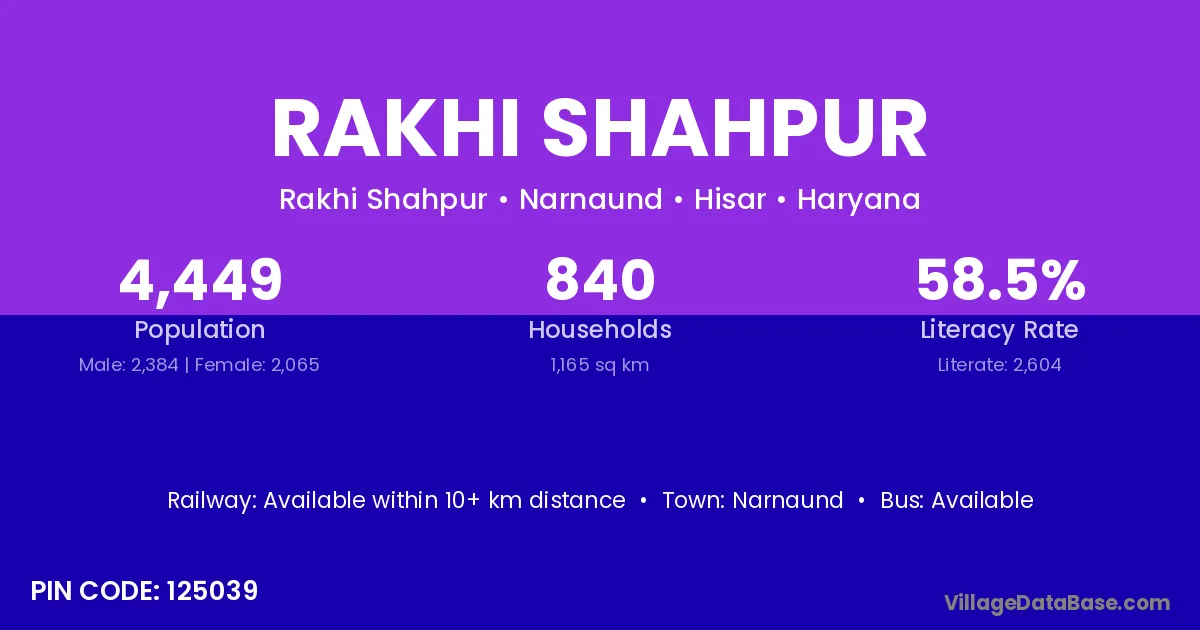 Rakhi Shahpur village has a total population of 4,449 people, of which 2,384 are males and 2,065 are females.
